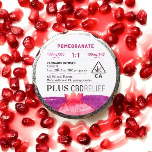 CBD Relief Pomegranate 1:1 CBD/THC gummy, 0.1g or 100 milligrams, a tenth of a gram, from the PLUS brand offering a hybrid, CBD experience with 100.0mg THC with 100.0mg CBD.