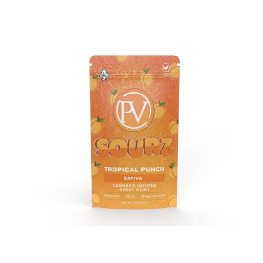 Sourz Tropical Punch by Platinum Vape is meticulously crafted on candy traditions of its German origins. Each uniquely flavored gummy provides a delightfully chewy experience and offers it consumers feelings of Happy, Uplifted, Energetic, Creative, Relaxed. Our resealable bags are filled with 10 Gummy Coins that contain 10mg THC in California, 10mg THC and 20mg THC in Oklahoma & Michigan.