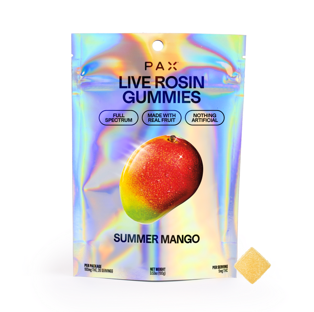 PAX Live Rosin Gummies bring together the best of the flower with solventless live rosin with the all-natural great taste of real fruit. Get the right balance of flower and feels with every bite.