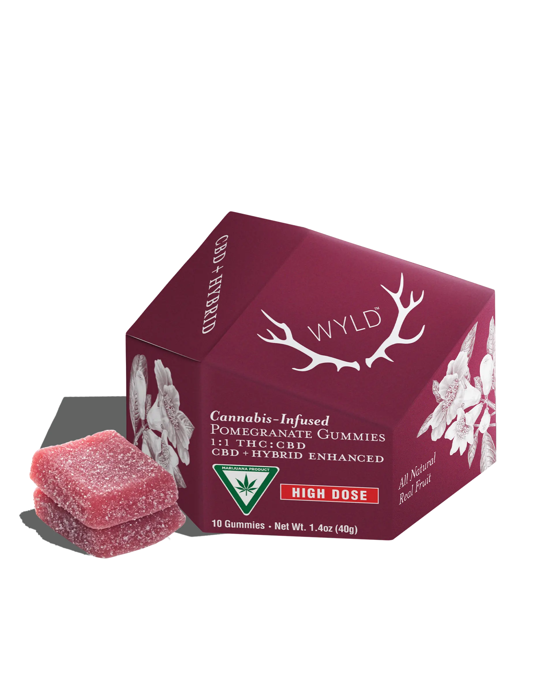 wyld pomegranate gummies, we’ve taken the best of both worlds with our Pomegranate gummies. They are a great compliment to any adventure by providing a balanced and enjoyable high for both mind and body using a Hybrid terpene blend. If you are new or sensitive to edibles, the Pomegranate gummies are an excellent place to start. Have some before getting into your yoga routine, or climbing to the highest peak.